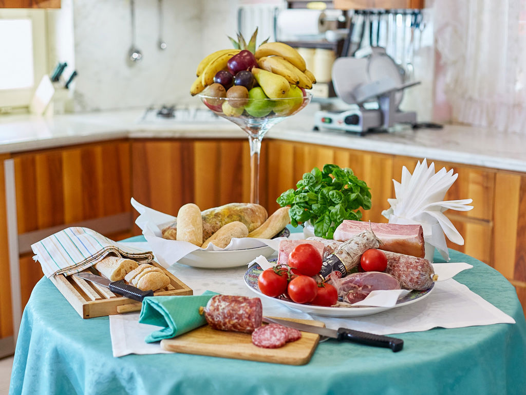 Caffè americano, cappuccino, tea, tisane latte caldo o macchiato, cioccolata calda, brioches di ogni genere, spremute fresche, succhi di frutta, marmellate e nutella, yogurt, frutta fresca e macedonia assortita.